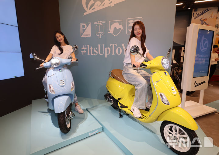 [서울=뉴시스] 김근수 기자 = 6일 서울 강남구 베스파 모토플렉스 서울점에서 열린 이탈리아 아이코닉 모터사이클 브랜드 베스파(VESPA) 신모델 출시행사에서 모델들이 프리마베라와 스프린트S를 선보이고 있다. 2024.09.06. [email protected]