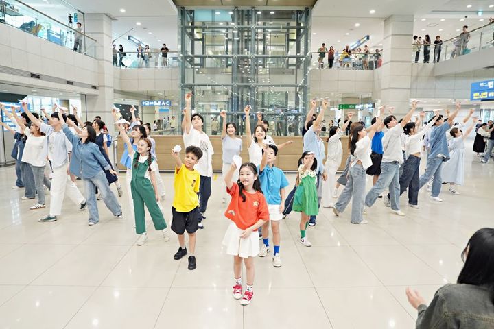 문화체육관광부 주최·한국문화예술교육진흥원 주관으로 선보인 이번 플래시몹은 국민의 문화예술교육 체감도를 높이고 일상 속 문화예술 향유 기회를 제공하기 위해 마련됐다. 15년간 국립발레단 수석 무용수로 활약한 김주원 발레리나가 총예술감독을 맡아 서경대학교 뮤지컬학과 전공생, 꿈의 무용단 송파(송파문화재단) 단원·가족, 하트 시각장애인 체임버 오케스트라 등 약 100여 명이 추석 명절을 맞아 많은 여객이 오가는 인천국제공항 입국장에서 깜짝 공연을 선보였다. (사진=한국문화예술교육진흥원 제공) 2024.09.07. [email protected] *재판매 및 DB 금지