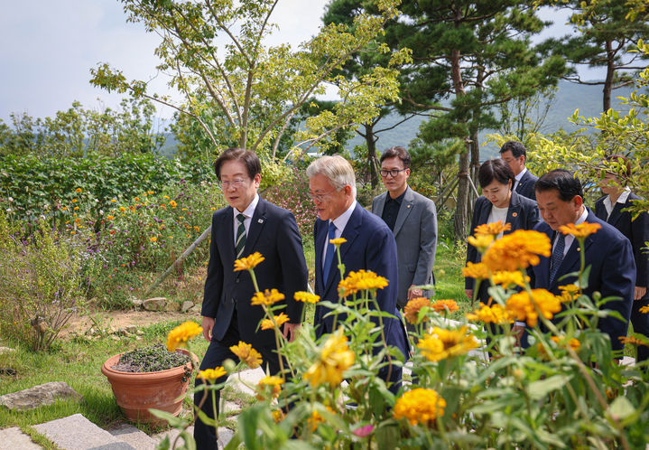 [서울=뉴시스] 권창회 기자 = 이재명 더불어민주당 대표와 문재인 전 대통령이 8일 경남 양산시 하북면 평산마을 문 전 대통령 사저에서 최고위원들과 함께 이동하고 있다. (사진=더불어민주당 제공) 2024.09.08. [email protected] *재판매 및 DB 금지