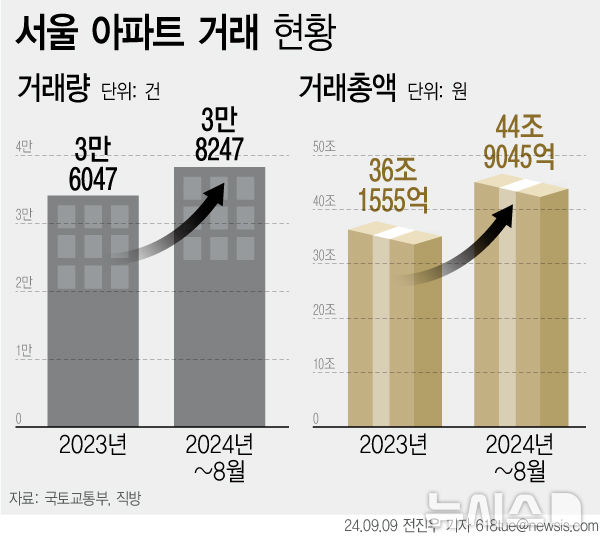 [서울=뉴시스] 9일 직방의 국토교통부 아파트 실거래가 분석에 따르면 올해 1~8월 서울의 거래량은 3만8247건, 거래총액은 44조9045억원으로 지난해와 비교해 거래량은 112%, 거래총액은 124%에 달했다. (그래픽=전진우 기자)