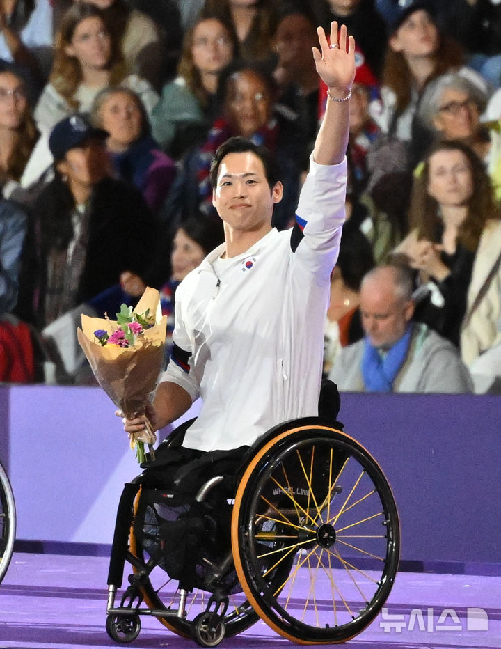 [생드니=뉴시스] 사진공동취재단 = 9일 프랑스 생드니 스타드 드 프랑스에서 열린 2024 파리 패럴림픽 폐회식에서 국제패럴림픽위원회(IPC) 선수위원에 당선된 원유민이 손을 흔들고 있다. 2024.09.09. [email protected]