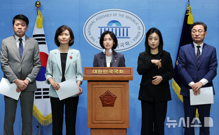 [서울=뉴시스] 조성우 기자 = 박은정(가운데) 등 조국혁신당 의원들이 9일 오전 서울 여의도 국회 소통관에서 '딥페이크 차단 6법(서지현법)' 발의 기자회견을 하고 있다.