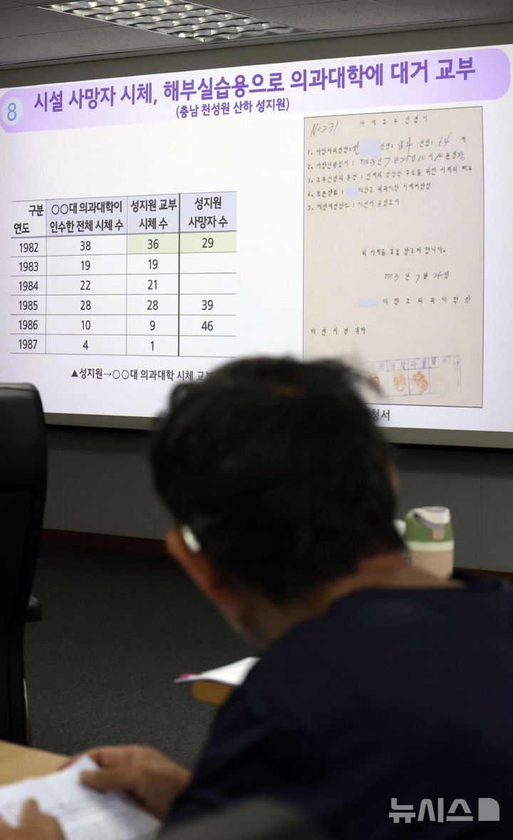 [서울=뉴시스] 최동준 기자 = 9일 서울 중구 진실화해위원회에서 열린 서울시립갱생원 등 성인부랑인시설 인권침해 사건 진실규명 결정 발표 기자간담회에서 성인부랑인수용시설 인권침해 피해자가 사건 개요 발표 화면을 바라보고 있다. 2024.09.09. [email protected]