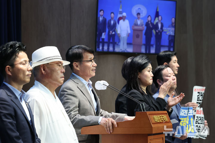 [서울=뉴시스] 권창회 기자 = 최재형 목사가 9일 오후 서울 여의도 국회 소통관에서 열린 검찰 수사심의위원회 결과 규탄 기자회견에서 발언하고 있다. 2024.09.09. [email protected]