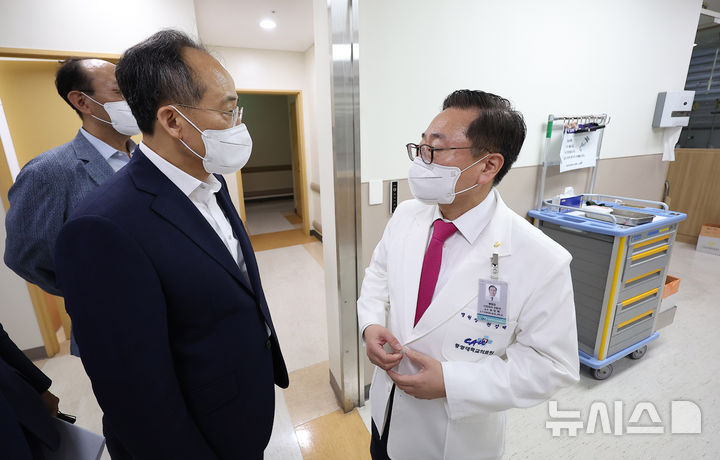 [서울=뉴시스] 추상철 기자 = 추경호 국민의힘 원내대표가 11일 오전 서울 동작구 중앙대학교병원을 찾아 권정택 병원장과 대화하고 있다. (공동취재) 2024.09.11. [email protected]