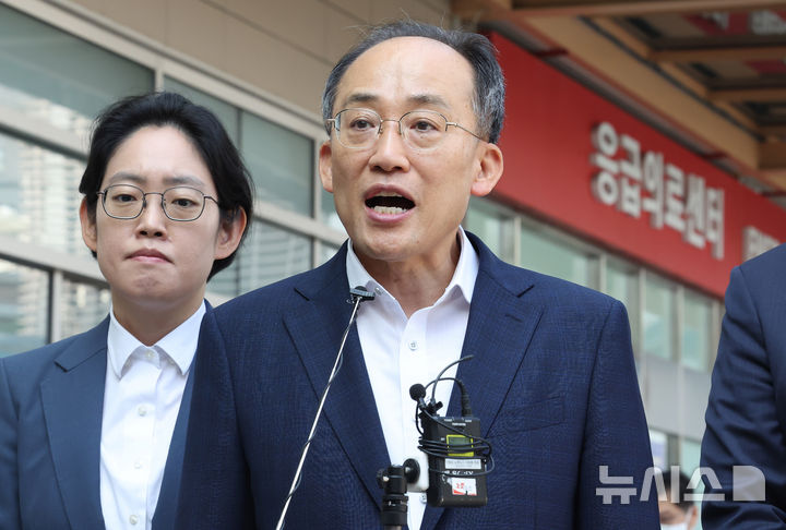 [서울=뉴시스] 추상철 기자 = 추경호 국민의힘 원내대표가 11일 오전 서울 동작구 중앙대학교병원에서 응급진료체계 현장방문을 마친 후 발언하고 있다. (공동취재) 2024.09.11. [email protected]
