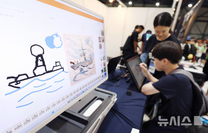 [서울=뉴시스] 김진아 기자 = 11일 서울 강남구 SETEC에서 열린 ‘강남 디지털 DNA(Dream New Area) 페스티벌’에서 학생들이 웹툰으로 즐기는 생성형 AI 체험-Tooning에 대해 배우고 있다. 2024.09.11. [email protected]