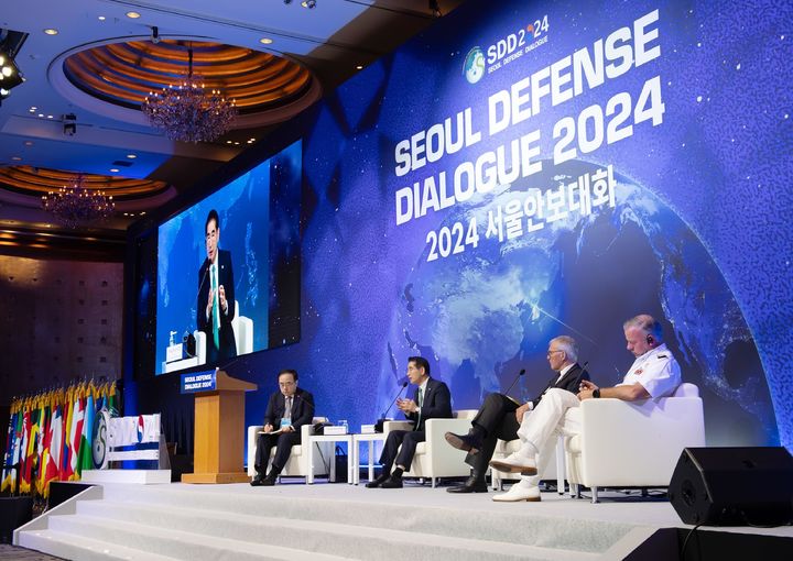 [서울=뉴시스] 김용현 국방부 장관이 11일 서울 중구 롯데호텔에서 열린 2024 서울안보대화 본회의 세션1에서 질의응답을 하고 있다. (사진=국방부 제공) 2024.09.11. photo@newsis.com *재판매 및 DB 금지