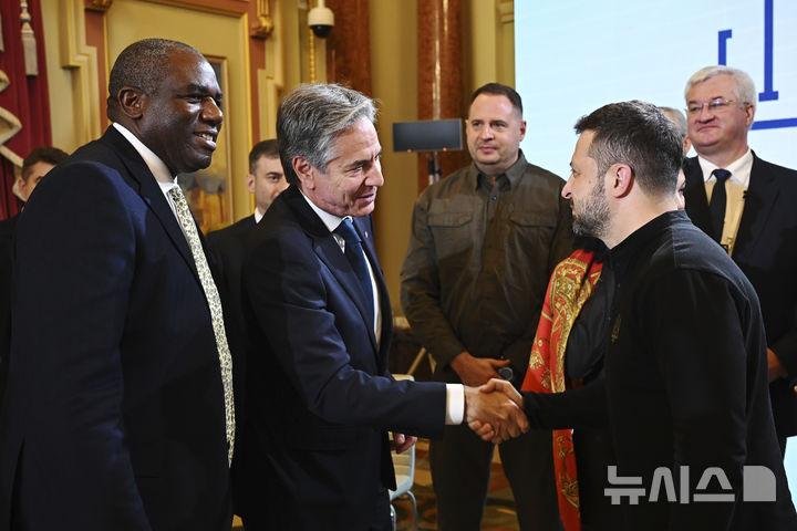 [키이우=AP/뉴시스] 토니 블링컨(가운데) 미국 국무장관이 데이비드 래미(왼쪽) 영국 외무장관과 함께 11일(현지시각) 우크라이나 키이우에서 열린 제4차 크림반도 정상회의에 참석해 볼로디미르 젤렌스키 우크라이나 대통령과 악수하고 있다. 블링컨 장관은 무기 사용 제한을 풀어달라는 우크라이나의 요청을 신속히 검토하겠다고 약속했다. 2024.09.12.