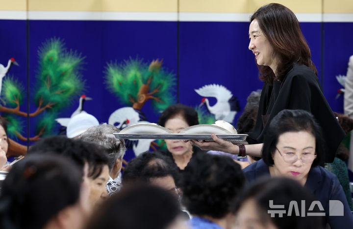 [서울=뉴시스] 이영환 기자 = 김수경 통일부 차관이 13일 서울 강서구 남북통합문화센터에서 열린 2024 탈북민 어르신 초청 추석 맞이 고향 음식 나눔 행사에서 어르신들에게 음식을 전하고 있다. 2024.09.13. [email protected]