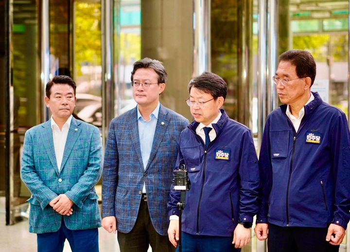 [서울=뉴시스] 조성봉 기자 = 국회 행정안전위원회와 환경노동위원회 소속 더불어민주당 의원들이 '경찰의 과잉진압'과 관련해 13일 서울 서대문구 미근동 경찰청을 항의 방문하고 있다. 왼쪽부터 박정, 채현일, 박홍배, 김주영 의원.(사진=채현일 의원 페이스북)2024.09.13. [email protected]
