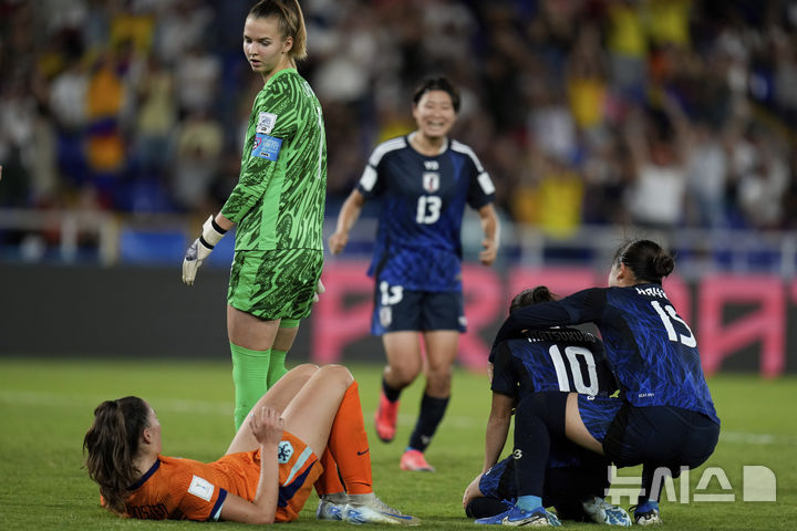 [칼리=AP/뉴시스] 일본의 마츠쿠보 마나카(10)가 18일(현지시각) 콜롬비아 칼리의 파스쿠알 게레로 경기장에서 열린 국제축구연맹(FIFA) 20세 이하(U20) 여자 월드컵 준결승 네덜란드와 경기 후반 33분 멀티 골을 완성한 후 동료들과 기뻐하고 있다. 일본이 마츠쿠보의 멀티 골로 네덜란드를 2-0으로 꺾고 결승에 올라 미국을 꺾은 북한과 우승을 다툰다. 2024.09.19.