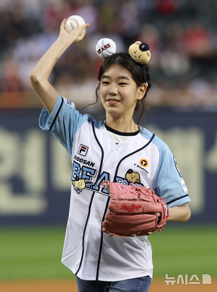 [서울=뉴시스] 추상철 기자 = 19일 오후 서울 송파구 잠실야구장에서 열린 2024 KBO리그 KIA 타이거즈와 두산 베어스의 경기, 아역배우 박소이가 시구하고 있다. 2024.09.19. [email protected]