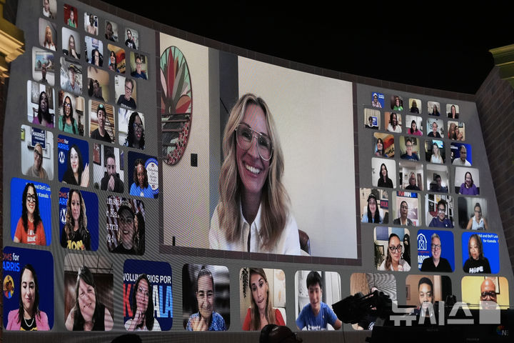 [파밍턴 힐스=AP/뉴시스] 배우 줄리아 로버츠가 19일(현지시각) 미 미시간주 파밍턴 힐스에서 열린 민주당 대선 후보 카멀라 해리스 부통령과 오프라 윈프리의 유튜브 생중계 토크쇼에 화상으로 참여하고 있다. 이 행사에서 총기 사고 피해자 가족들이 눈물을 흘리며 총기 규제를 촉구하고 의붓아버지에게 강간당한 여성이 낙태권을 옹호하기도 했다. 2024.09.20.