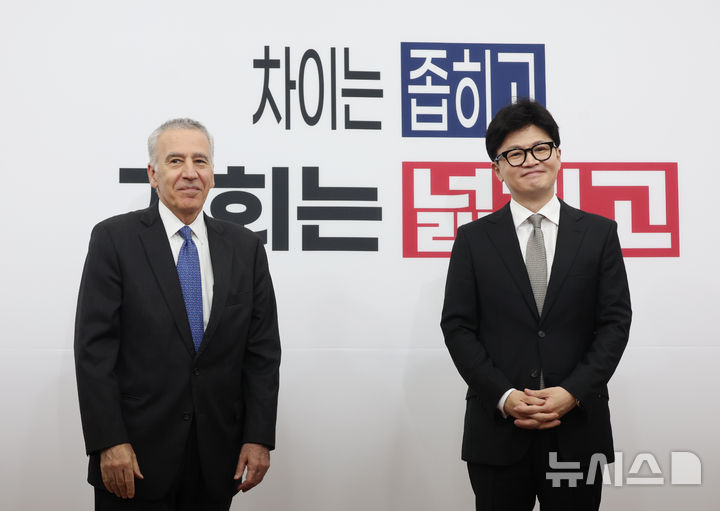 [서울=뉴시스] 고승민 기자 = 한동훈 국민의힘 대표와 필립 골드버그 주한미국대사가 20일 서울 여의도 국회에서 만나 기념촬영ㄱ하고 있다. 2024.09.20. [email protected]