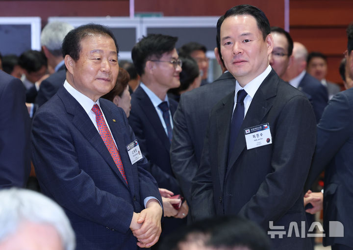 [프라하=뉴시스] 조수정 기자 = 허진수(오른쪽) SPC그룹 사장과 양재생 부산대한상의 회장이 20일(현지시각) 프라하 한 호텔에서 열린 한-체코 비즈니스포럼에서 대화를 나누고 있다. 2024.09.20. [email protected]