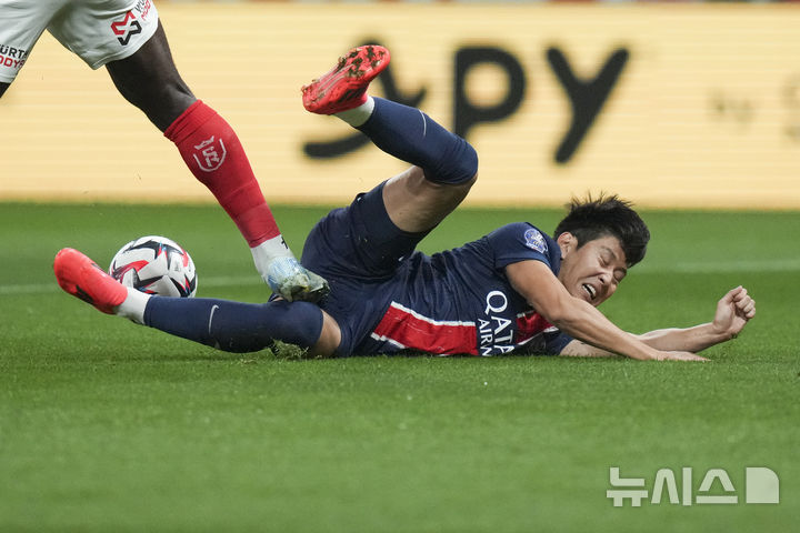 [랭스=AP/뉴시스] 파리 생제르맹(PSG)의 이강인이 21일(현지시각) 프랑스 랭스의 스타드 오귀스트 드로네에서 열린 2024-25시즌 리그1 5라운드 스타드 랭스와 경기 중 공을 다투다 넘어지고 있다. 이강인은 83분을 소화했고 PSG는 1-1로 비겼다. 2024.09.22.