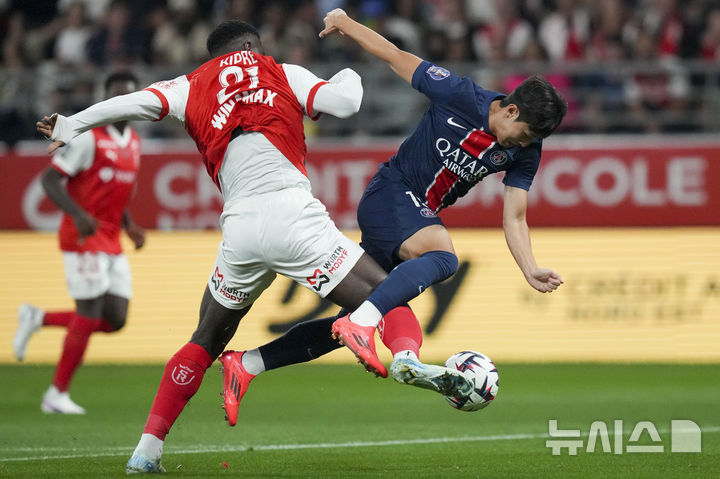 [랭스=AP/뉴시스] 파리 생제르맹(PSG)의 이강인이 21일(현지시각) 프랑스 랭스의 스타드 오귀스트 드로네에서 열린 2024-25시즌 리그1 5라운드 스타드 랭스와 경기 중 공을 다투고 있다. 이강인은 83분을 소화했고 PSG는 1-1로 비겼다. 2024.09.22.