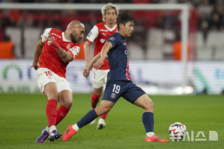 [랭스=AP/뉴시스] 파리 생제르맹(PSG)의 이강인이 21일(현지시각) 프랑스 랭스의 스타드 오귀스트 드로네에서 열린 2024-25시즌 리그1 5라운드 스타드 랭스와 경기 중 공을 몰고 있다. 이강인은 83분을 소화했고 PSG는 1-1로 비겼다. 2024.09.22.