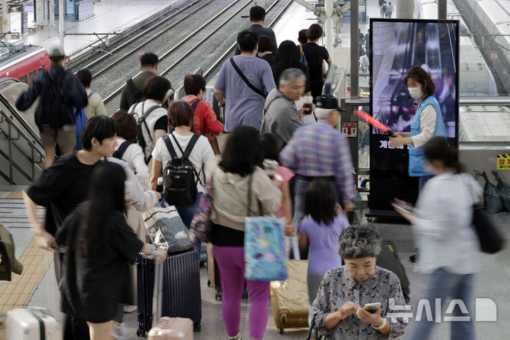 [서울=뉴시스] 최동준 기자 = 22일 서울 용산구 서울역 승강장이 집중호우에 따른 일부열차 지연으로 인해 승객들이 몰려 혼잡한 모습을 보이고 있다. 2024.09.22. [email protected]