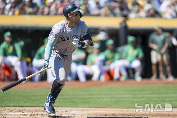 [오클랜드=AP/뉴시스] 뉴욕 양키스의 애런 저지가 22일(현지시각) 미 캘리포니아주 오클랜드의 오클랜드 콜리시엄에서 열린 2024 메이저리그 오클랜드 애슬레틱스와의 경기 3회 초 1점 홈런(시즌 55호)을 친 후 타구를 바라보고 있다. 저지는 3타수 2안타(1홈런) 1타점 2득점 2볼넷으로 활약하며 팀의 7-4 승리를 이끌었다. 2024.09.23.