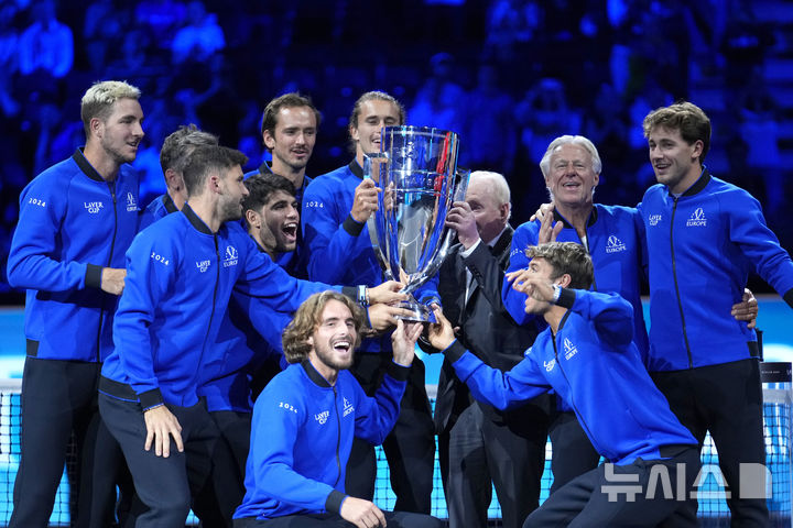[베를린=AP/뉴시스] 팀 유럽 선수단이 22일(현지시각) 독일 베를린의 우버 아레나에서 열린 2024 레이버컵에서 우승한 후 트로피를 들고 기념 촬영하고 있다. 카를로스 알카라스(스페인) 등이 활약한 테일러 프리츠(미국) 등이 활약한 팀 월드를 최종 13-11로 꺾고 3년 만에 우승을 차지했다. 레이버컵은 각 6명으로 구성된 팀 유럽과 팀 월드가 맞붙는 남자 테니스 대항전이다. 2024.09.23.