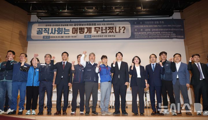 [서울=뉴시스] 조성봉 기자 = 김동명 (왼쪽 일곱번째) 한국노총 위원장, 이해준(왼쪽 두번째) 전국공무원노조 위원장을 비롯한 참석자들이 23일 오후 서울 여의도 국회 의원회관 대회의실에서 열린 '공무원, 교사임금 현실화를 위한 공무원보수위원회법 제정 국회 대토론회'에서 기념촬영을 하고 있다.  2024.09.23. [email protected]