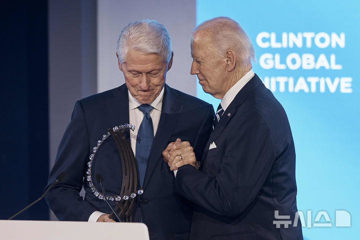 [뉴욕=AP/뉴시스] 조 바이든(오른쪽) 미국 대통령이 23일(현지시각) 미국 뉴욕에서 열린 클린턴 글로벌 이니셔티브 자선 기구 연례행사에 참석해 재단 설립자인 빌 클린턴 전 대통령으로부터 '글로벌 시티즌' 상을 받고 있다. 바이든 대통령은 수상 후 "이걸 받는 것은 이른바 꼼짝 못 하고 잡혔다는 걸 의미한다"라고 농담을 던졌다. 2024.09.24.