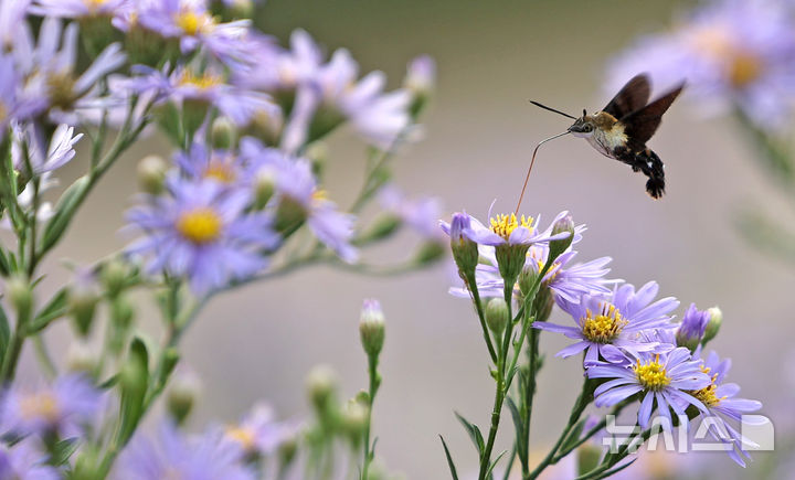 [안동=뉴시스] 이무열 기자 = 완연한 가을로 들어선 24일 경북 안동시 하회마을 개미취 꽃밭에서 검은꼬리 박각시나방이 꿀을 따고 있다. 2024.09.24. [email protected]
