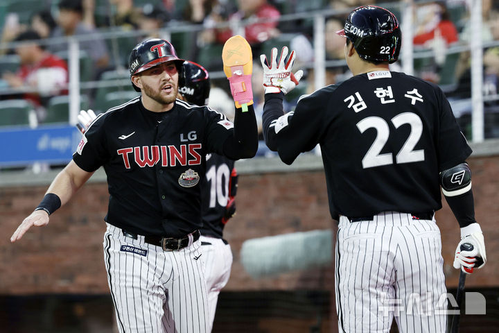 [인천=뉴시스] 최동준 기자 = 24일 인천 미추홀구 SSG랜더스필드에서 열린 2024 KBO리그 LG 트윈스와 SSG 랜더스의 경기, 1회초 1사 만루 상황 SSG 유격수 박성한의 실책 때 득점한 LG 오스틴이 김현수와 하이파이브하고 있다. 2024.09.24. [email protected]