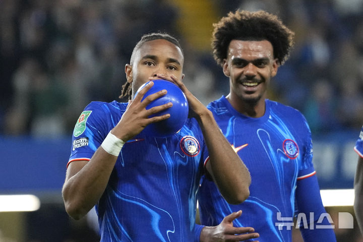 [런던=AP/뉴시스] 첼시의 크리스토퍼 은쿤쿠가 24일(현지시각) 영국 런던의 스탬퍼드 브리지 스타디움에서 열린 4부리그 배로와 경기 후반 30분 팀의 다섯 번째 골이자 본인의 해트트릭을 완성한 후 아들이 좋아하는 세리머니를 위해 풍선을 불고 있다. 첼시가 4부리그 배로를 5-0으로 대파했다. 2024.09.25.