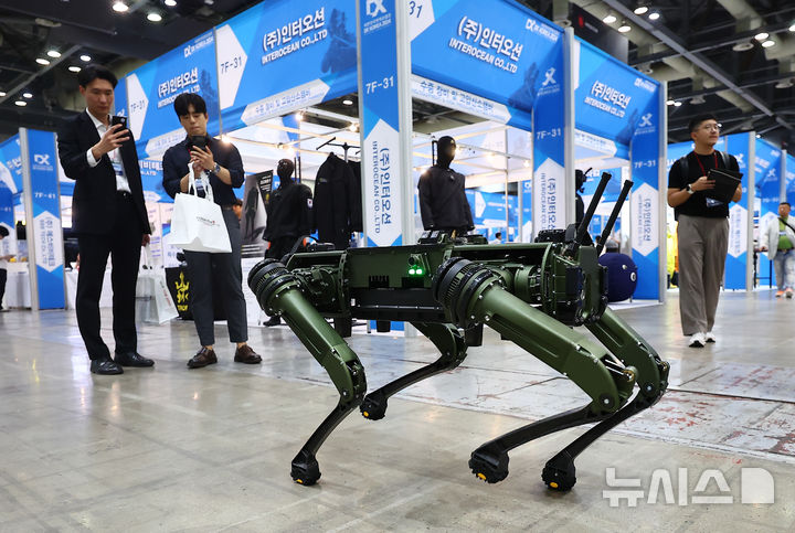 [고양=뉴시스] 김근수 기자 = 25일 경기 고양 킨텍스에서 열린 제6회 대한민국 방위 산업전에서 관람객들이 정찰 로봇을 살펴보고 있다. 2024.09.25. [email protected]