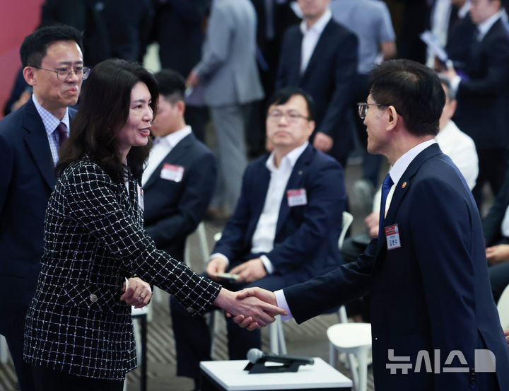 [서울=뉴시스] 최진석 기자 = 유혜미 저출생대응수석과 김문수 고용노동부 장관이 25일 서울 영등포구 여의도 중소기업중앙회에서 '일·가정 양립 우수기업 성과 공유'를 주제로 열린 4차 인구비상대책회의에서 인사를 나누고 있다. (대통령실통신사진기자단) 2024.09.25. [email protected]