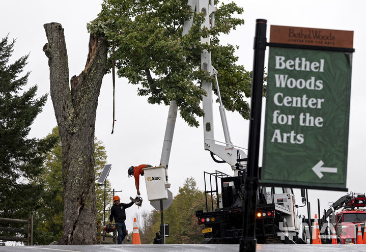 [베셀=AP/뉴시스] 25일(현지시각) 미 뉴욕주 베셀 아트센터에 있는, 우드스톡 페스티벌의 전설적인 '메시지 나무'가 잘려 나가고 있다. 관계 당국은 100년 이상 된, 높이 18m가량의 이 나무 상태가 나빠져 쓰러질 위험에 처해 많은 아쉬움 속에 잘라야 했다고 전했다. 휴대전화가 없던 1969년 우드스톡 페스티벌이 처음 시작할 때부터 관람객들은 종이나 판지에 메시지를 적어 공연 안내소 옆에 있던 이 나무에 붙여 소통한 것으로 유명하다. 2024.09.26.