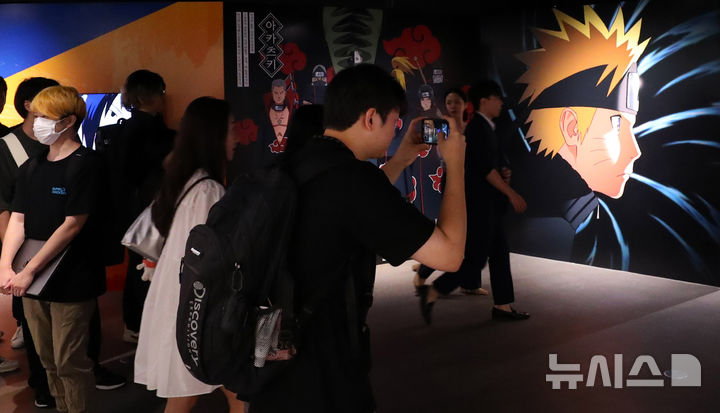 [서울=뉴시스] 김혜진 기자 = 26일 오후 서울 마포구 카카오프렌즈 홍대 플래그십 스토어에서 열린 애니메이션 '나루토' 탄생 20주년 기념 '나루토 더 갤러리' 프레스 행사를 찾은 관계자들이 전시를 둘러보고 있다. 2024.09.26. [email protected]