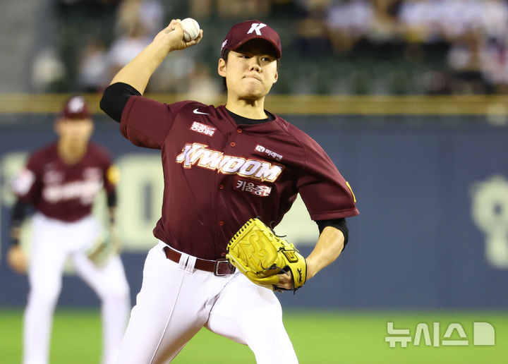 [서울=뉴시스] 황준선 기자 = 26일 서울 송파구 잠실야구장에서 열린 2024 KBO리그 키움 히어로즈와 LG 트윈스의 경기, 1회 말 키움 선발 김윤하가 공을 던지고 있다. 2024.09.26. [email protected]