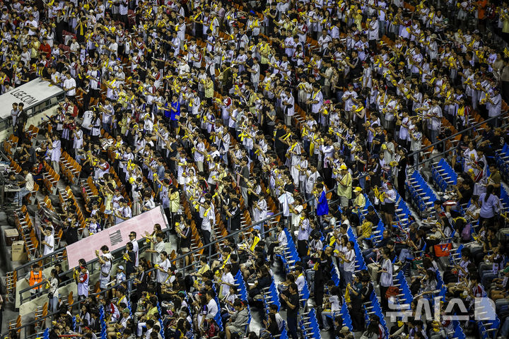 [서울=뉴시스] 정병혁 기자 = 26일 서울 송파구 잠실야구장에서 열린 2024 KBO리그 키움 히어로즈 대 LG 트윈스의 경기를 찾은 관중들이 응원을 하고 있다. 2024.09.26. [email protected]