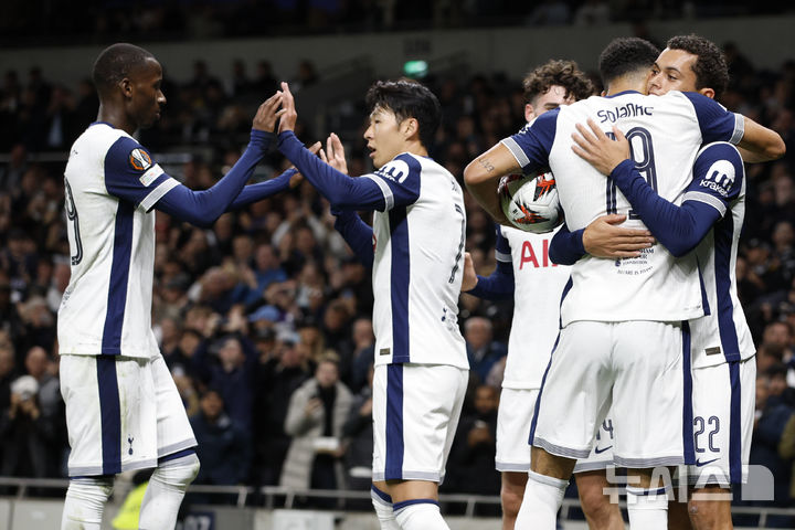 [런던=AP/뉴시스] 토트넘 홋스퍼의 손흥민(왼쪽 두 번째)이 26일(현지시각) 영국 런던의 토트넘 홋스퍼 스타디움에서 열린 2024-25 유럽축구연맹(UEFA) 유로파리그(UEL) 리그 페이즈 1차전 카라바흐 (아제르바이잔)와 경기 후반 23분 도미닉 솔란케(오른쪽 두 번째)의 쐐기 골에 기뻐하고 있다. 손흥민은 71분을 뛰었고 토트넘은 1명이 퇴장당한 수적 열세를 극복하고 3-0으로 승리했다. 2024.09.27.