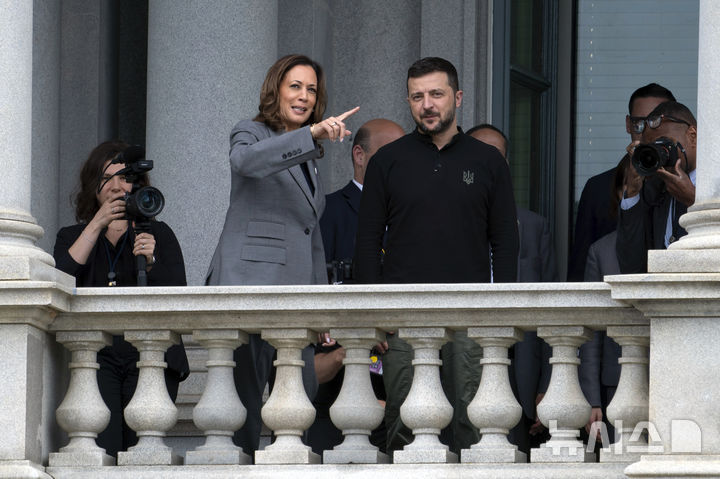 [워싱턴=AP/뉴시스] 카멀라 해리스(왼쪽) 미국 부통령과 볼로디미르 젤렌스키 우크라이나 대통령이 26일(현지시각) 백악관 아이젠하워 행정동 발코니에서 얘기를 나누고 있다. 해리스 부통령은 “우크라이나가 영토의 많은 부분을 포기하도록 강요하는 사람들이 우리나라에 있다”라고 에둘러 도널드 트럼프 전 대통령을 비판하면서 "미국의 전략적 이익에 부합하기에 우크라이나의 승리에 필요한 지원을 계속할 것"이라고 말했다. 2024.09.27.