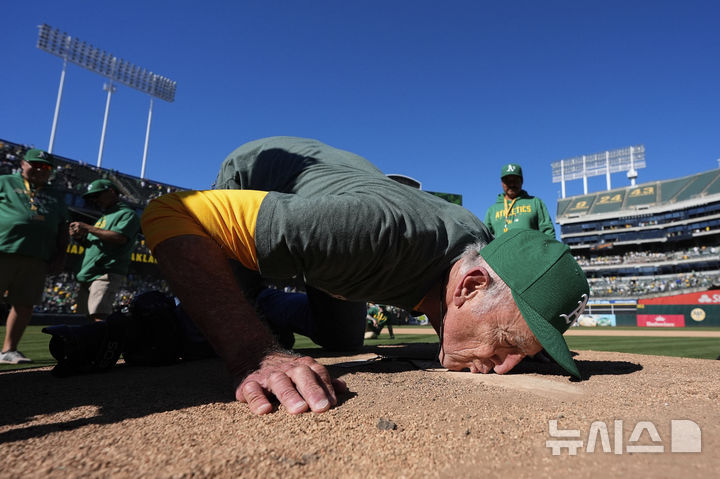 [오클랜드=AP/뉴시스] 오클랜드 애슬레틱스 구단의 전속 사진가 마이클 자거리스가 26일(현지시각) 미 캘리포니아주 오클랜드의 오클랜드 콜리세움에서 열린 2024 메이저리그 텍사스 레인저스와의 홈구장 마지막 경기를 3-2 승리로 마친 후 투수 마운드에 입 맞추고 있다. 애슬레틱스는 네바다주 라스베이거스로 연고지를 옮겨 2028년부터 신축 구장에서 일정을 시작하며 2027년까지는 새크라멘토 리버캐츠의 서터 헬스 파크에서 경기를 치른다. 2024.09.27.