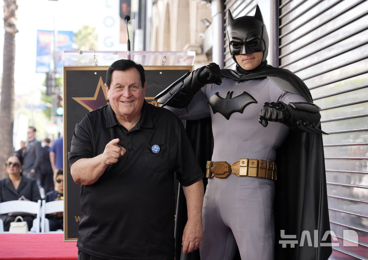 [로스앤젤레스=AP/뉴시스] 영화 캐릭터 배트맨이 슈퍼히어로 최초로 할리우드 명예의 거리에 헌액돼 26일(현지시각) 미 캘리포니아주 로스앤젤레스에서 배트맨 복장을 한 남성이 60년대 TV 시리즈 '배트맨'에서 로빈 역할을 했던 배우 버트 워드와 별판 위에 서서 포즈를 취하고 있다. 배트맨은 2790번째 영화 부문 별판에 이름을 올린 동시에 슈퍼히어로 중 처음으로 명예의 거리에 오르는 기네스 세계 기록에도 올랐다. 2024.09.27.