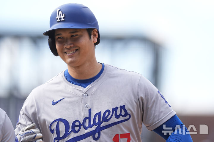[덴버=AP/뉴시스] LA 다저스의 오타니 쇼헤이가 29일(현지시각) 미 콜로라도주 덴버의 쿠어스필드에서 열린 2024 메이저리그(MLB) 콜로라도 로키스와 경기 8회 초 우전 안타를 치고 1루에 나가 활짝 웃고 있다. 오타니는 이후 도루를 추가해 54홈런 59도루로 시즌을 마감했고 다저스는 2-1로 역전승했다. 2024.09.30.