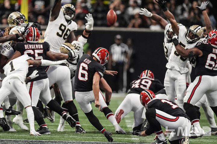 [애틀랜타=AP/뉴시스] 애틀랜타 팰컨스의 키커 구영회(가운데)가 29일(현지시각) 미 조지아주 애틀랜타의 메르세데스-벤츠 스타디움에서 열린 미국프로풋볼(NFL) 뉴올리언스 세인츠와 경기 종료 직전 58야드 필드골을 차고 있다. 구영회가 이 골을 성공하며 애틀랜타가 26-24로 역전승을 거뒀다. 2024.09.30.