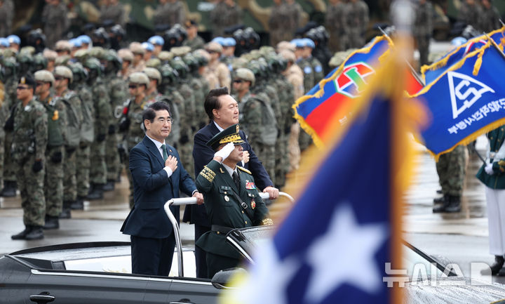 [성남=뉴시스] 조수정 기자 = 윤석열 대통령이 1일 성남 서울공항에서 열린 건군 제76주년 국군의날 기념식에서 열병차량에 탑승해 사열하고 있다. 2024.10.01. [email protected]