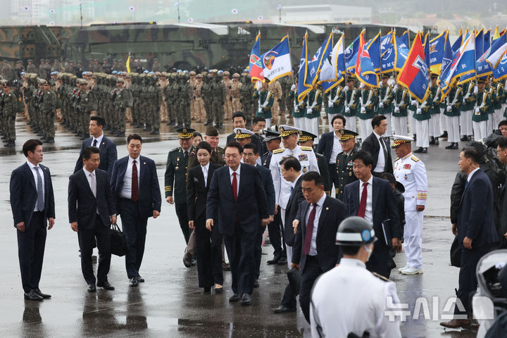 [성남=뉴시스] 조수정 기자 = 윤석열 대통령과 부인 김건희 여사가 1일 성남 서울공항에서 열린 건군 제76주년 국군의날 기념식에 입장하고 있다. 2024.10.01. [email protected]