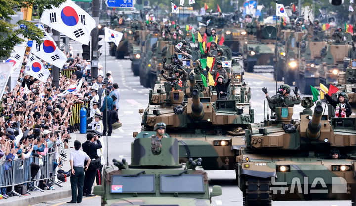 [서울=뉴시스] 최진석 기자 = 1일 서울 광화문 일대에서 열린 건군 76주년 국군의날 시가행진에서 기갑부대 및 기계화보병부대가 이동하고 있다. (대통령실통신사진기자단) 2024.10.01. [email protected]