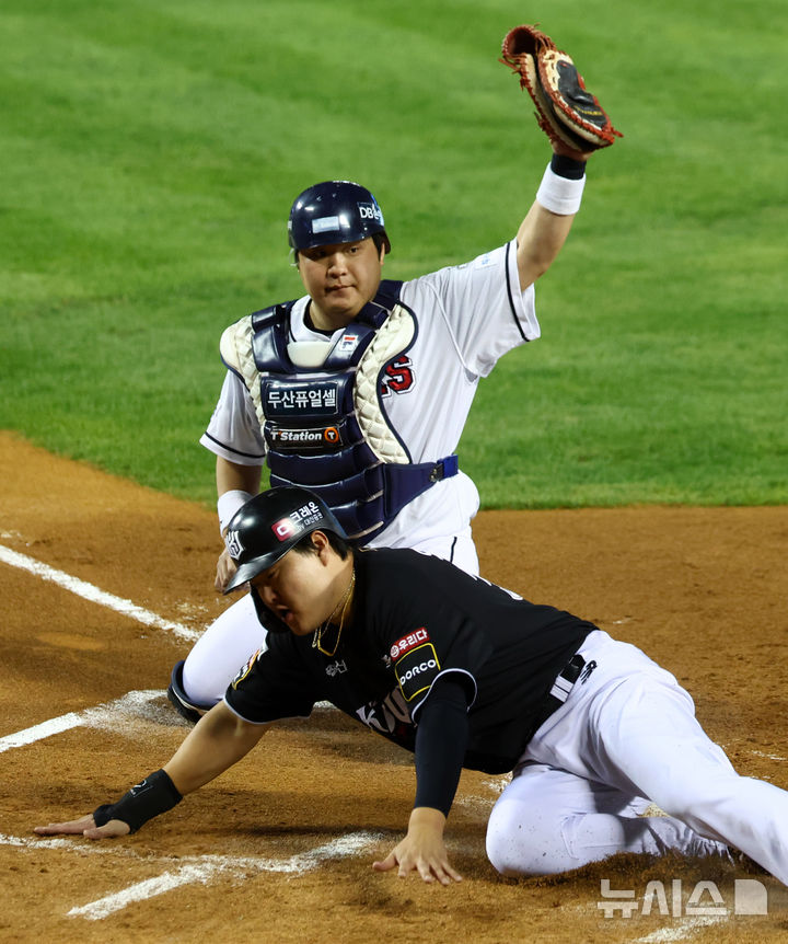 [서울=뉴시스] 전신 기자 = 2일 서울 잠실야구장에서 열린 2024 KBO리그 와일드카드 1차전 kt 위즈와 두산 베어스 경기에서 1회초 2사 2, 3루 kt 배정대의 중견수 앞 1루타 때 2루 주자 오재일이 홈에서 태그아웃되고 있다. 2024.10.02. [email protected]