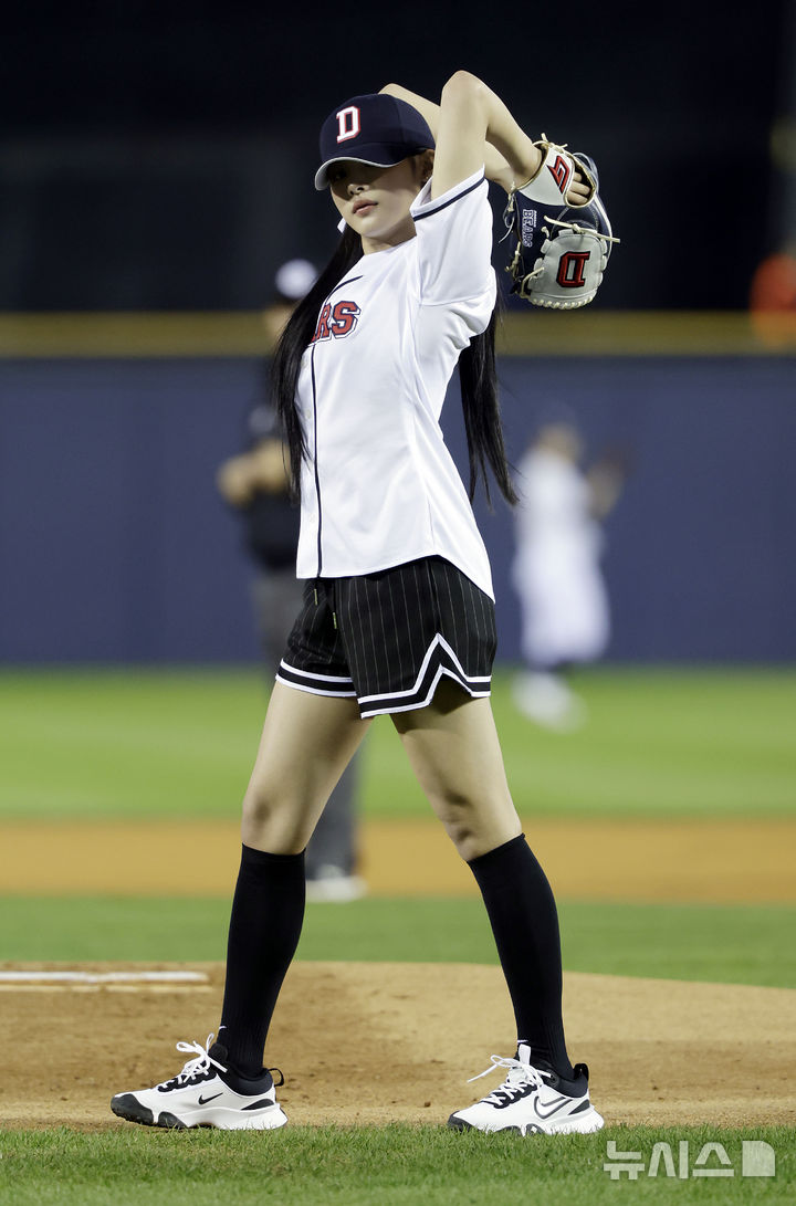 [서울=뉴시스] 최동준 기자 = 2일 서울 잠실야구장에서 열린 2024 KBO리그 와일드카드 1차전 kt 위즈와 두산 베어스 경기에 앞서 뉴진스 민지가 시구를 하고 있다. 2024.10.02. [email protected]