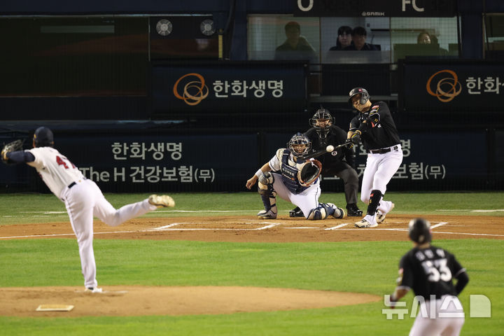 [서울=뉴시스] 황준선 기자 = 2일 서울 송파구 잠실야구장에서 열린 2024 KBO 포스트시즌 와일드카드 결정 1차전 kt 위즈와 두산 베어스의 경기, 1회초 무사 1, 2루 상황 kt 장성우가 1타점 적시타를 치고 있다. 2023.10.02. [email protected]