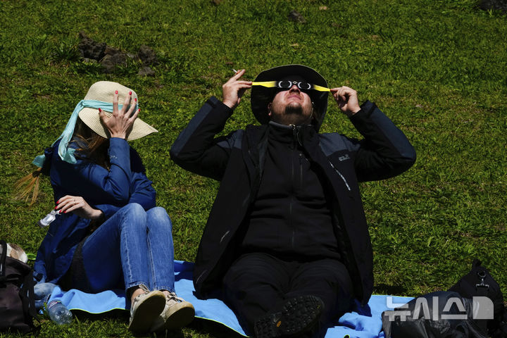 [이스터섬=AP/뉴시스] 2일(현지시각) 칠레 이스터섬의 타하이에서 관광객들이 관측경을 이용해 달이 태양 앞을 지나며 가장자리 부분이 금반지 모양으로 보이는 '금환일식'을 관측하고 있다. 2024.10.03.